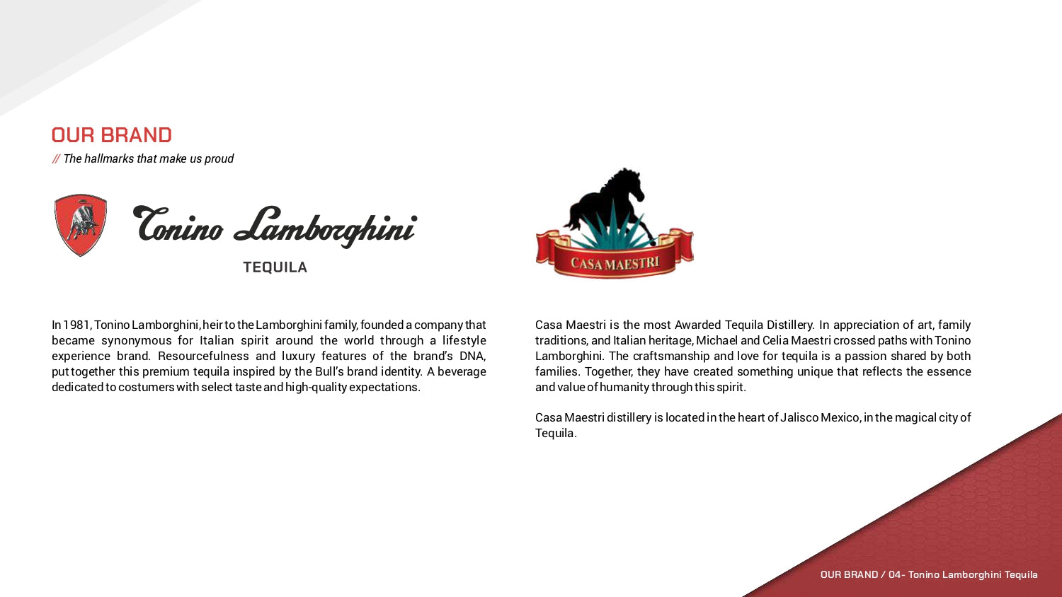 Tonino Lamborghini Tequila is a celebration of fine art, family traditions, and Italian heritage, brought together with the passion for Mexican tequila-making. It is a premium handcrafted spirit born as a symbol of quality and luxury.